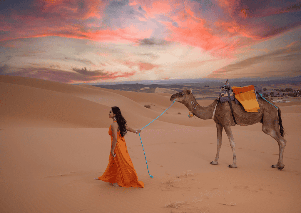 After breakfast, continue to the Todra Gorges near Tinghir — where the river has carved a soaring red canyon through the mountains. Walk freely through the gorge. Drive through palm groves for a lunch stop along the way. Arrive at the Merzouga Sahara desert in the afternoon. Switch to camels and cross the Erg Chebbi dunes at sunset, pausing on a high dune to watch the magical colours unfold. Arrive at the luxury desert camp for traditional dinner, Berber music, and a night beneath a blazing sky of stars. Overnight in camp.