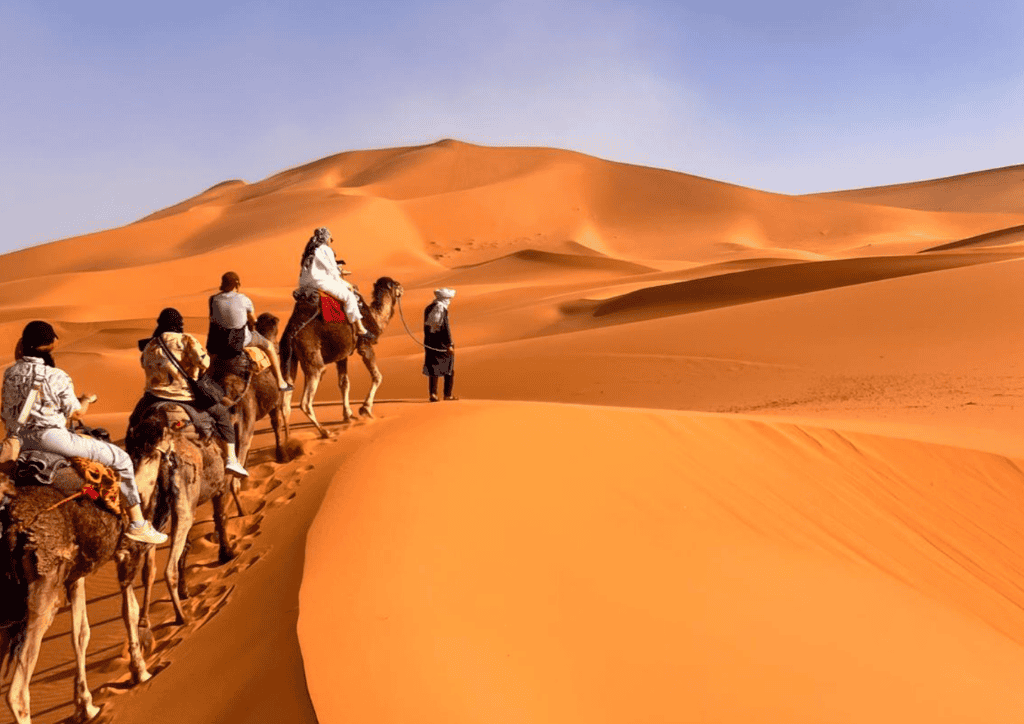 – Riding camels across the Erg Chebbi dunes at golden hour